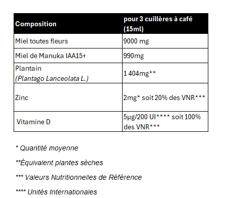 Déconseillé aux enfants de moins de 3 ans ainsi qu'aux femmes enceintes et allaitantes. Déconseillé en cas d'asthme ou d'allergies, notamment aux produits de la ruche. Ne pas consommer en cas d'hypersensibilité au pollen de plantain lancéolé. Ne pas dépasser la portion recommandée à consommer chaque jour, veiller à avoir une alimentation variée et équilibrée et un mode de vie sain. Tenir hors de la portée des jeunes enfants. À conserver dans un endroit frais, sec et à l'abri de la lumière. Après ouverture, à consommer dans les 30 jours.
