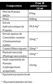 Miels (Miel toutes fleurs (44,7% soit 918 mg), Miel de Manuka (4,7% soit 97 mg)), Extrait hydroalcoolique de